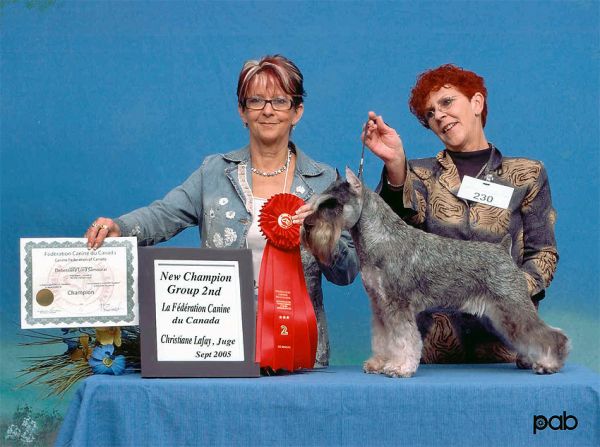 Gagnant de meilleur de la race dans des spécialités canadienne et américaine, gagnant en 2007 , meilleur mâle reproducteur à la spécialité nationale canadienne du miniature schnauzer du Canada.